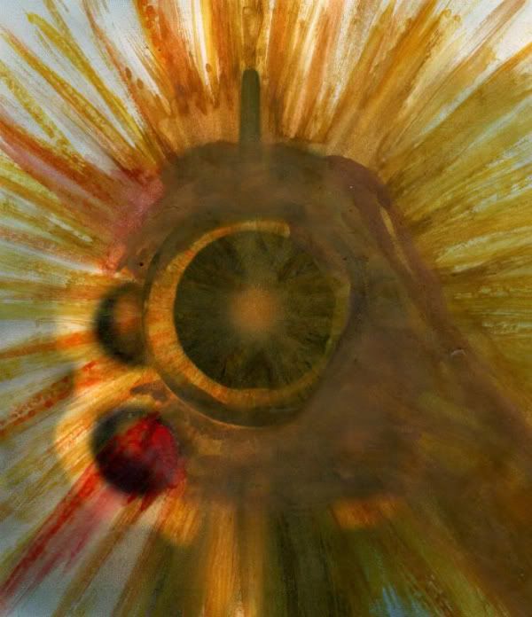 Notice how the blast insinuated from behind the clutching fist over the revolver's gun barrel a coronal blast of light almost resembling raw sewage? That's intentional, considering the source material of this illustration, which happens to be a scene from the ultraviolent splatterpunk postapocalyptic science fiction terror tale WAITING FOR THE END, by Vincent Daemon. Google it, but be warned, a record of your having Googled it will be filed away permanently, not that anyone really cares so go for it, I dare you to read Mr. Daemon's uncompromising outtlook of a future so brutal as to render your own worst nightmares possibly more comfortable places to be condemned. Or copy and paste the following URL to read this violent science fantasy http://waitingforend.blogspot.com/